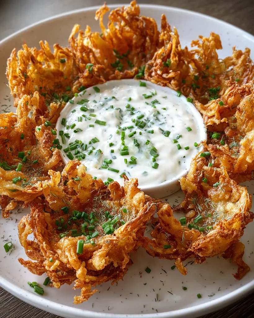 Carve your own onion into a blooming petal masterpiece, fry until golden, and serve the dip in the center. The contrast between the crisp onion and the smooth, tangy dip is simply divine.