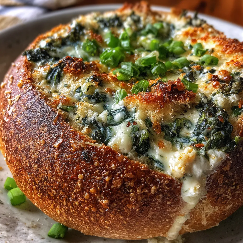 A garlicky, creamy spinach dip bakes inside a crusty bread bowl until gooey and golden, accented by crisp, toasted loaf pieces for scooping. Ideal for sharing warm at gatherings.