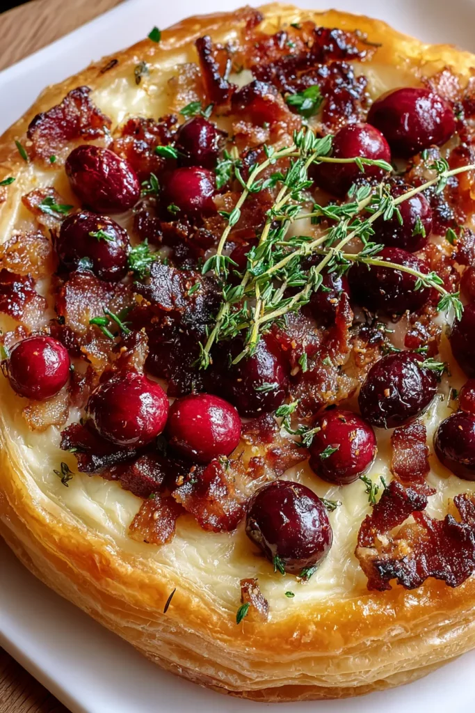 This delightful tart combines creamy Brie, tart cranberries, and crispy pancetta, enhanced with fresh thyme for a burst of flavor. It's an unforgettable appetizer!