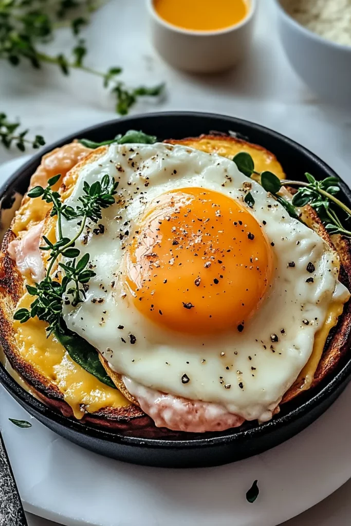 This golden-on-golden sandwich balances crisp toasted gluten-free bread with rich béchamel, savory ham, and melted Gruyère, crowned by a runny poached egg that oozes creamy goodness in every bite.