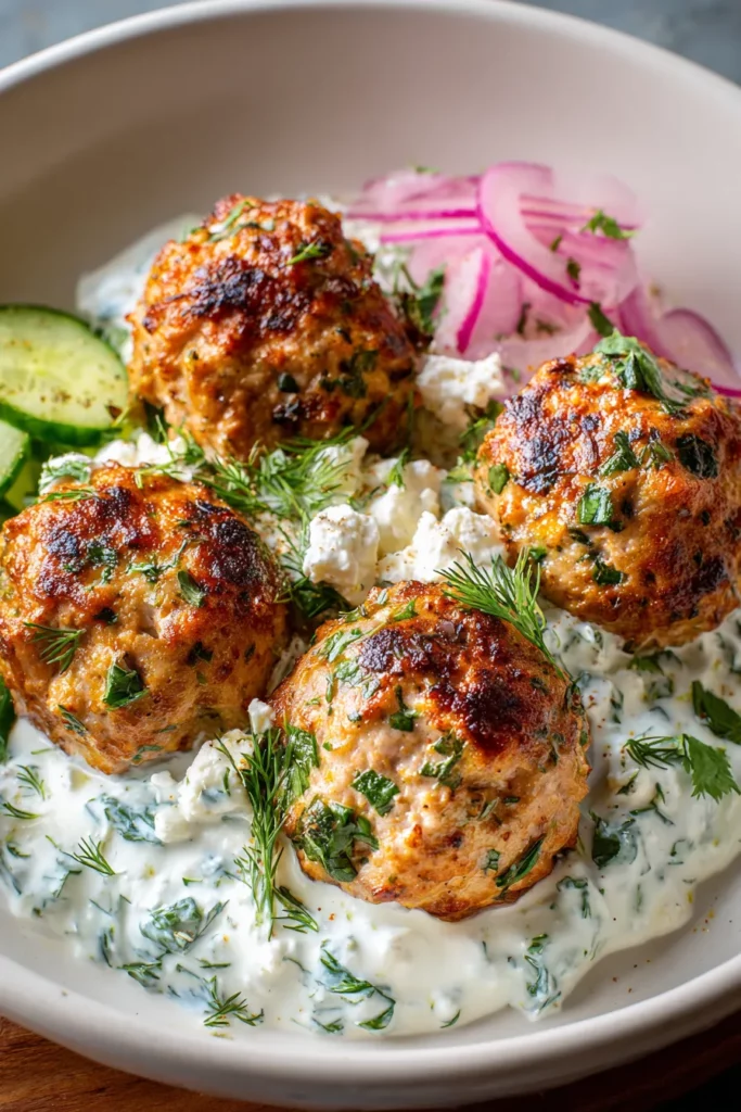 Savor the taste of juicy chicken meatballs infused with herbs and feta, perfectly paired with a refreshing homemade tzatziki. A delightful dish for any occasion!