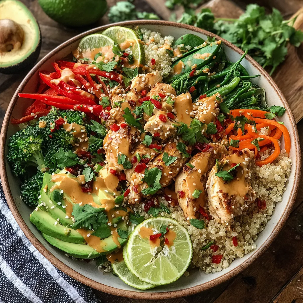 Let’s dive into transforming these ingredients into a vibrant, protein-packed dinner. You’ll start by creating a luscious peanut-ginger marinade, infuse the chicken with it, steam and blanch the veggies for perfect texture, then grill or pan-sear everything to juicy perfection. Finally, you’ll assemble your bowl layer by layer, topping it with fresh avocado, cilantro, and a final drizzle of sauce for the ultimate flavor bomb.