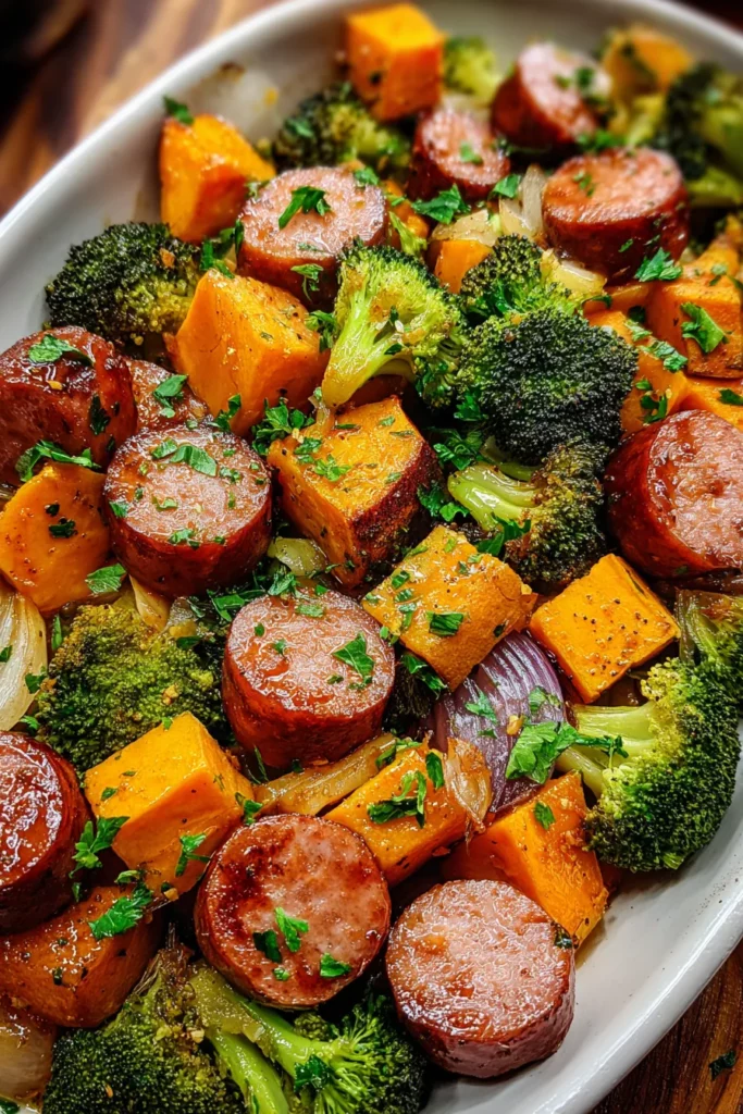 6. Bake in the preheated oven for 25–30 minutes. Stir halfway through to promote uniform browning. You’ll know it’s done when the sweet potatoes are fork-tender and the sausage slices are beautifully browned.