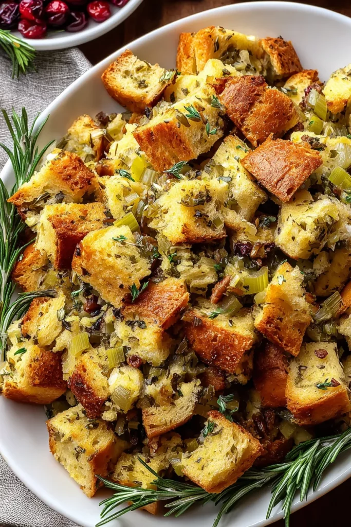 What truly sets this stuffing apart is the balance between soft, custardy crumbs and that irresistible golden crust which forms on top. As you mix in sautéed onions, crisp celery, and a hint of nutmeg, you’ll notice how the natural sweetness of dried cranberries and the gentle crunch of toasted pecans or walnuts (if you choose to add them) complements the savory herb profile. Whether you lean on classic chicken broth or swap in vegetable broth for a lighter twist, this recipe adapts to what you have on hand. It’s a cozy canvas for your culinary creativity, begging for family anecdotes, laughter, and perhaps even a dash of apple cider stirred into your liquid mix. You’ll find yourself returning to this recipe year after year, tucking its aroma into holiday memories.