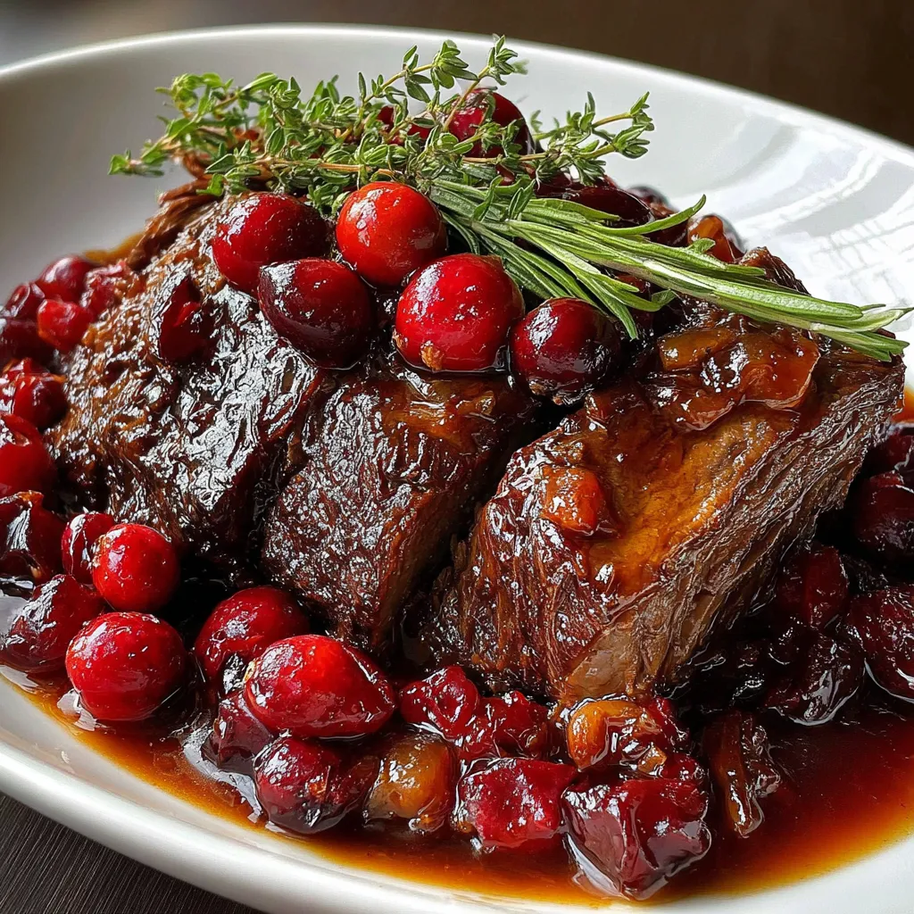 Fork-tender beef swims in a glossy cranberry-balsamic glaze, its rich meatiness brightened by fresh herbs. Each slice bursts with sweet-tart notes and savory depth, making every bite a symphony of flavor.