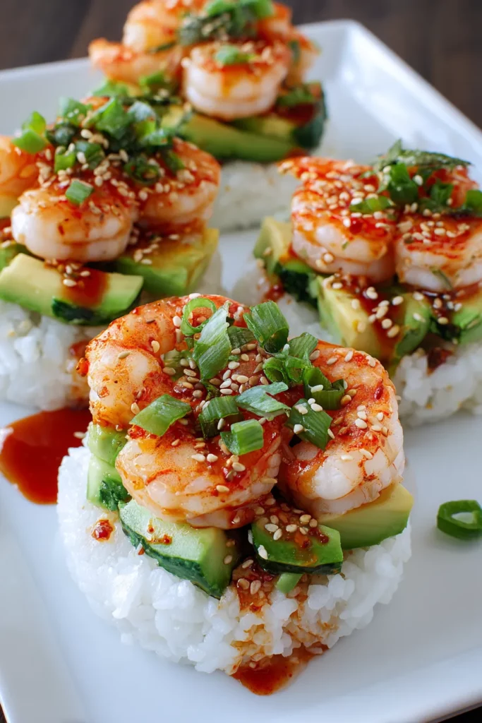 7. Serve immediately and enjoy the contrast of textures and bold flavors in every forkful of your Spicy Shrimp Sushi Stacks!