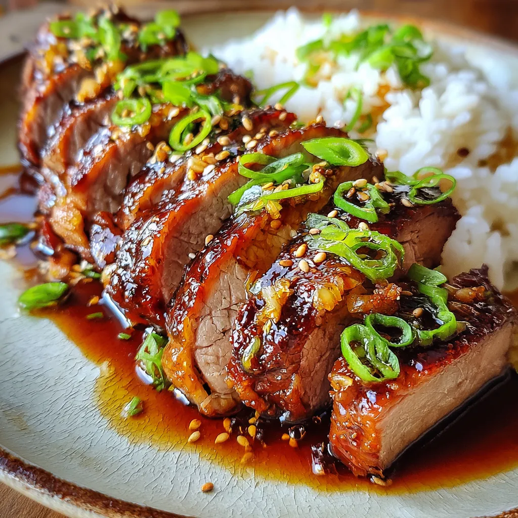 Experience the contrast of crisp seared edges giving way to moist, flavorful meat infused with garlic, ginger, and a touch of heat, finished with fresh green onions and toasted sesame seeds.