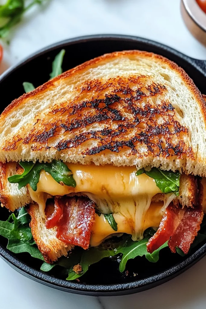 10. Slice each sandwich in half, revealing those layers of molten cheddar, smoky bacon, and vibrant veggies. Serve hot and savor the ultimate combination of textures and flavors.
